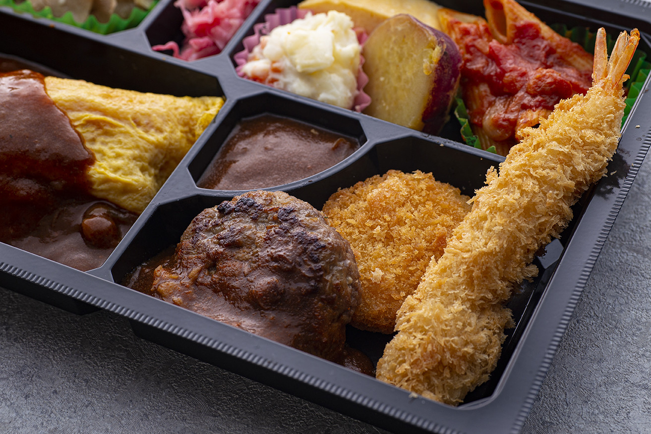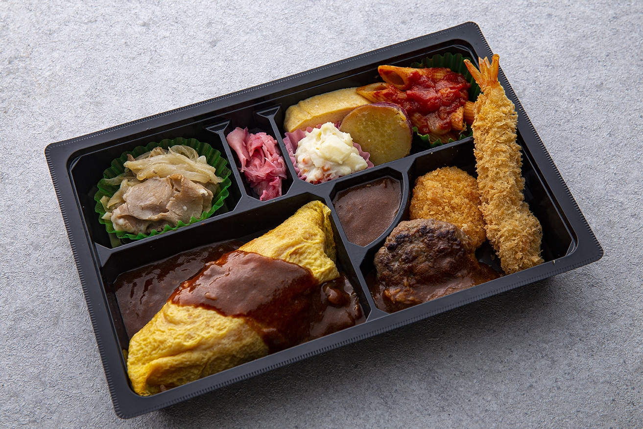 オムライス弁当 ¥1080(デミソースオムライス・自家製ハンバーグ・海老フライとコロッケ・チキンジンジャーソテーお楽しみ詰め合わせ)